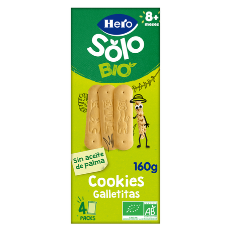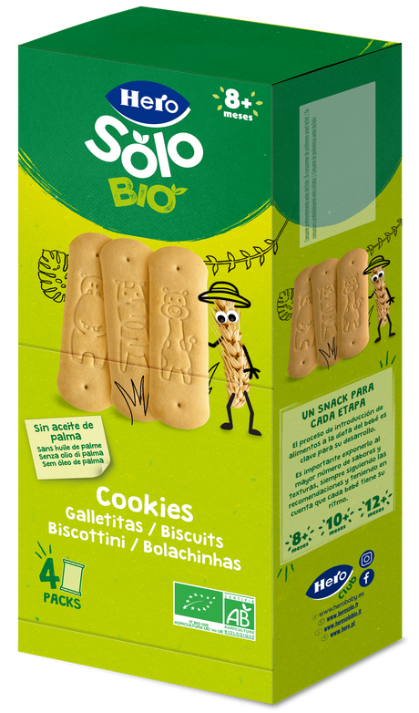 - Galleta Hero Solo Bio (+8 meses): pensada para los primeros contactos con nuevas texturas. Una buena forma de introducir las galletas en su alimentación.